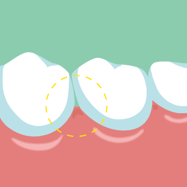 さらに、歯と歯の間や歯ぐきの近く(歯の根元) もプラークがたまりやすい場所。